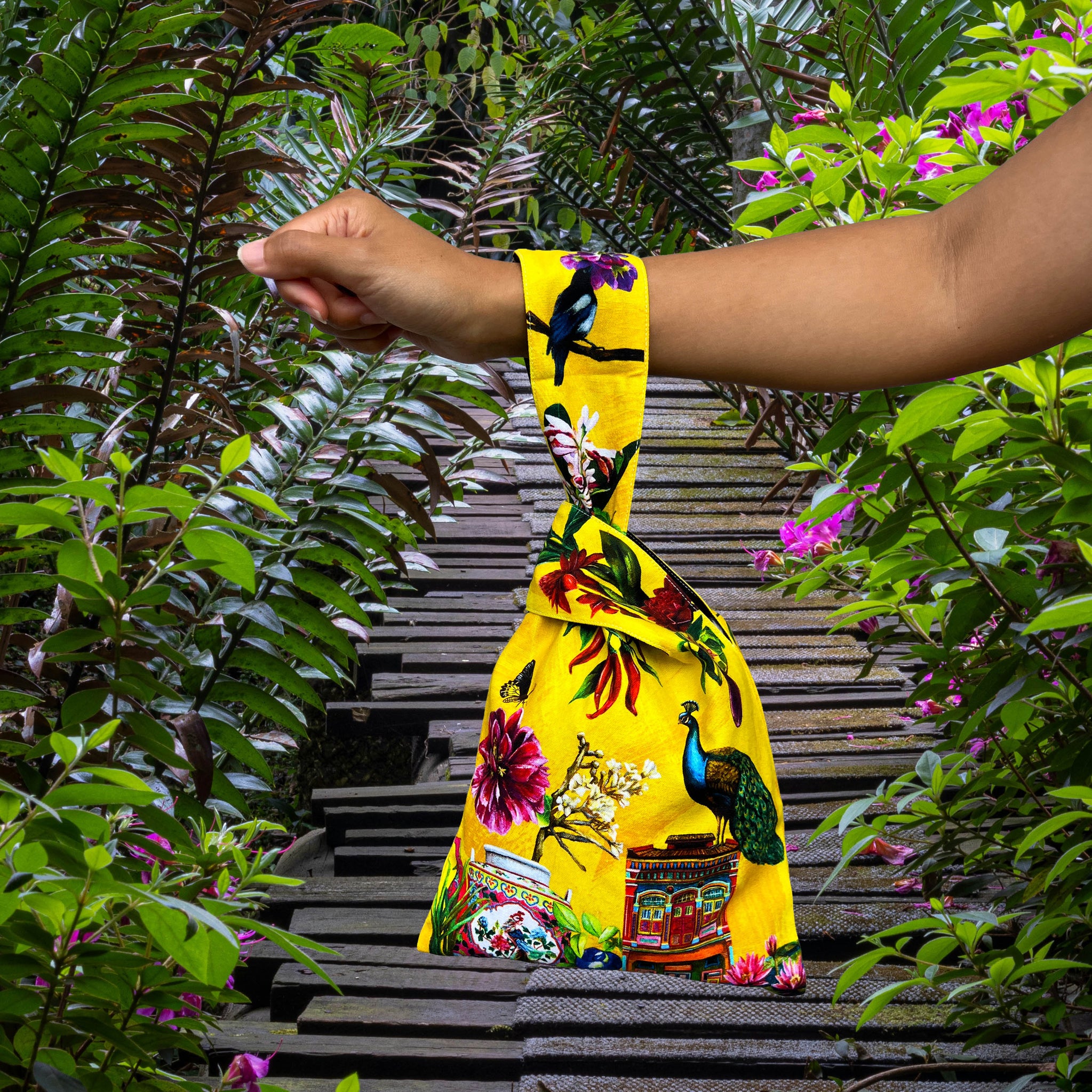 Luxuriously soft knot bag featuring motifs from 'City in Nature: Peranakan Treasures' — shophouse, butterfly pea flower, kaffir lime leaves, chilli, turmeric, eggplant and Nyonya porcelain. Includes a story card.