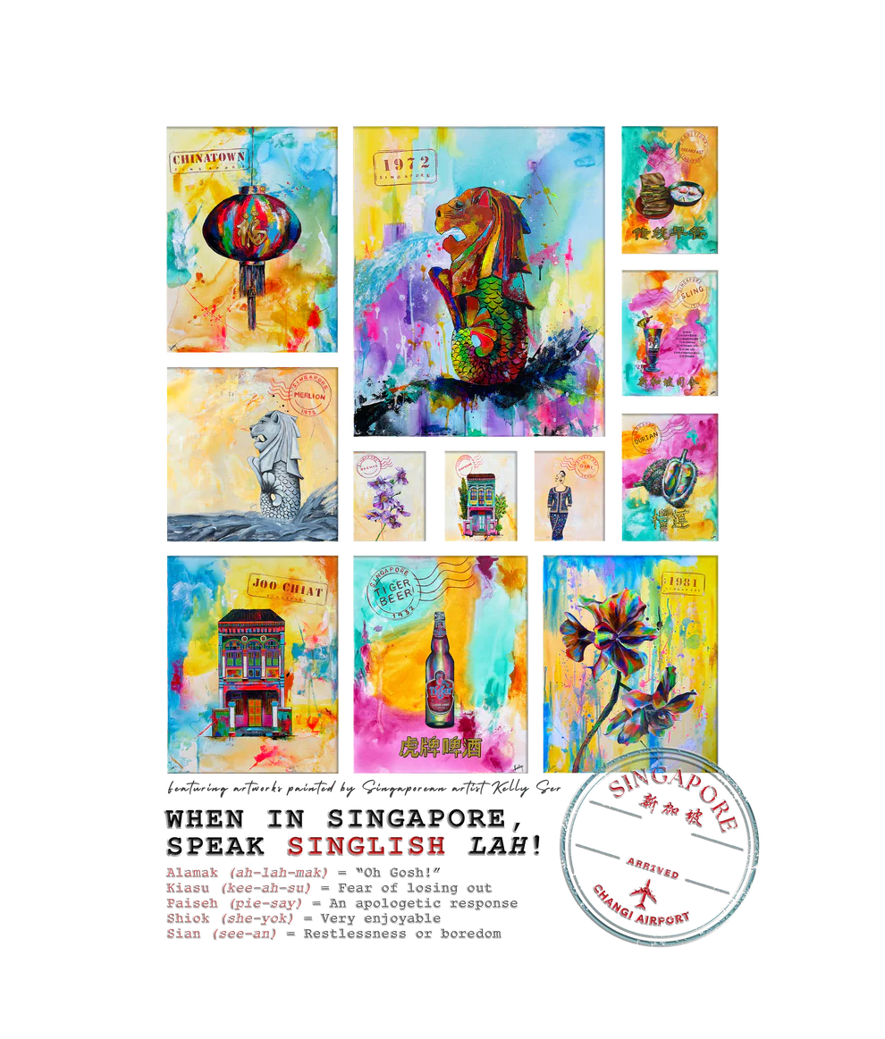 100% cotton tote featuring artworks from ‘Not Just a Little Red Dot’ and 'Singapura' with playful Singlish phrases. Zipper closure; machine washable.